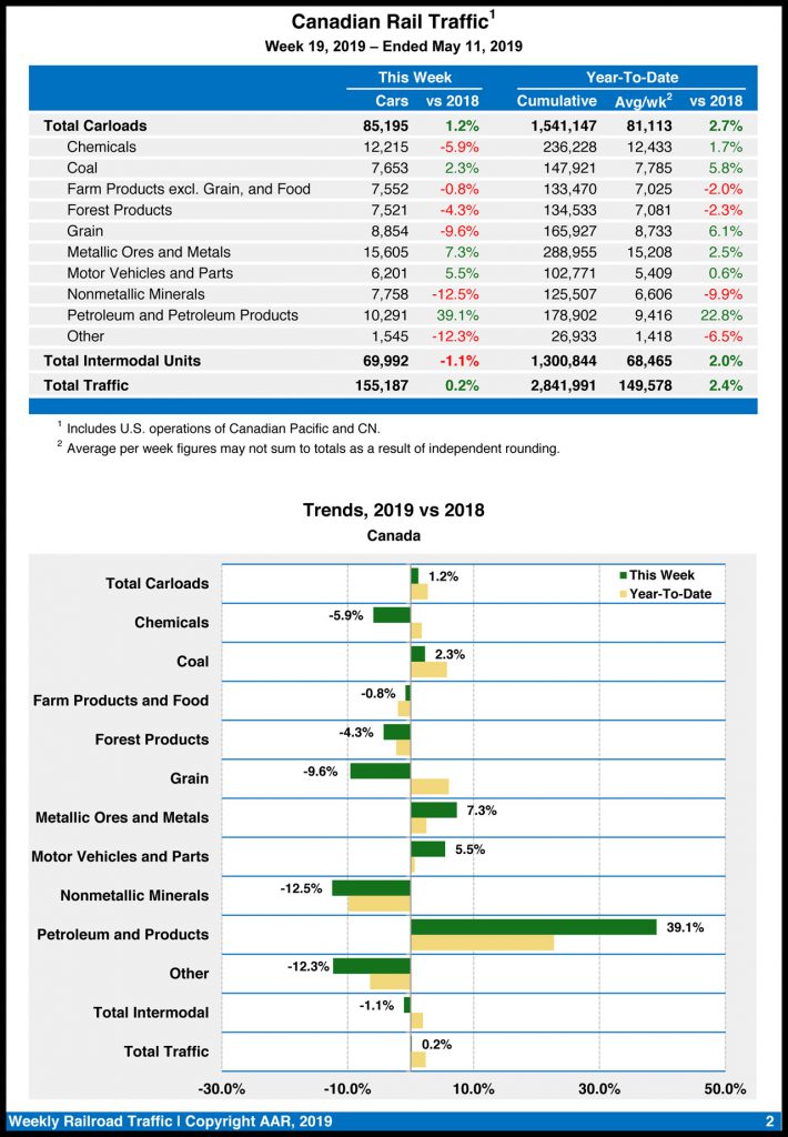 Canadian railroads reported 85,195 carloads for the week, up 1.2%, and 69,992 intermodal units, down 1.1% compared with the same week in 2018. For the first 19 weeks of 2019, Canadian railroads reported cumulative rail traffic volume of 2,841,991 carloads, containers and trailers, up 2.4%.