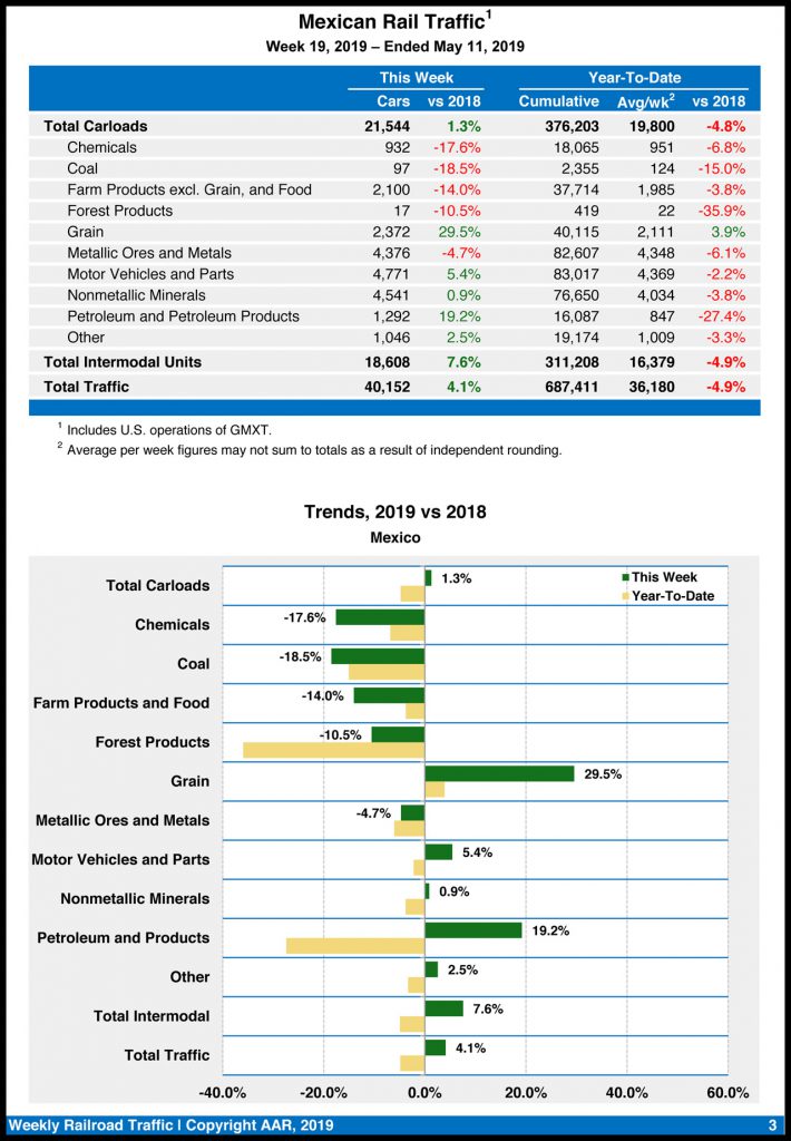 Mexican railroads reported 21,544 carloads for the week, up 1.3% compared with the same week last year, and 18,608 intermodal units, up 7.6%. Cumulative volume on Mexican railroads for the first 19 weeks of 2019 was 687,411 carloads and intermodal containers and trailers, down 4.9% from the same point last year.