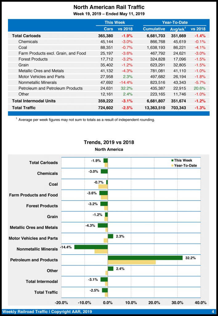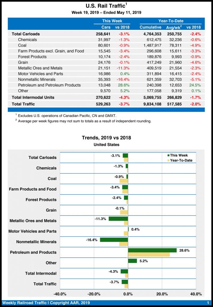 For the first 19 weeks of 2019, U.S. railroads reported cumulative volume of 4,764,353 carloads, down 2.4% from the same point last year; and 5,069,755 intermodal units, down 1.7% from last year. Total combined U.S. traffic for the first 19 weeks of 2019 was 9,834,108 carloads and intermodal units, a decrease of 2% compared to last year.