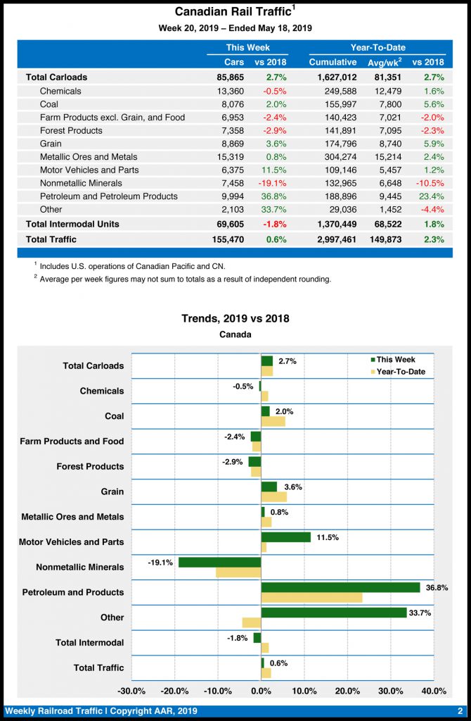 Canadian railroads reported 85,865 carloads for the week, up 2.7%, and 69,605 intermodal units, down 1.8% compared with the same week in 2018. For the first 20 weeks of 2019, Canadian railroads reported cumulative rail traffic volume of 2,997,461 carloads, containers and trailers, up 2.3%.