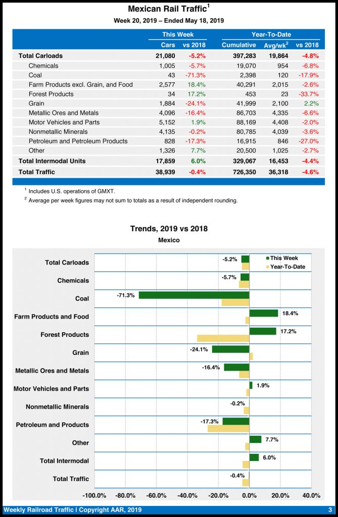 Mexican railroads reported 21,080 carloads for the week, down 5.2% compared with the same week last year, and 17,859 intermodal units, up 6%. Cumulative volume on Mexican railroads for the first 20 weeks of 2019 was 726,350 carloads and intermodal containers and trailers, down 4.6% from the same point last year.