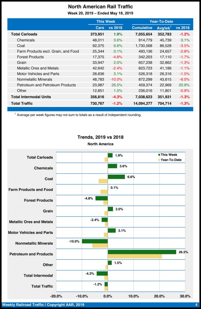 Continuing on other, more recent trends, however, commodity groups that posted decreases compared with the same week in 2018 included nonmetallic minerals, down 3,657 carloads, to 37,190; forest products, down 655 carloads, to 9,983; and miscellaneous carloads, down 432 carloads, to 9,422.
