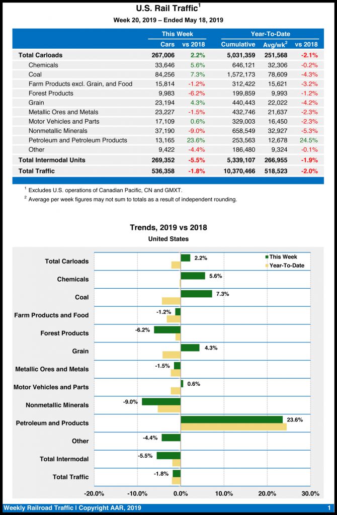 For the first 20 weeks of 2019, U.S. railroads reported cumulative volume of 5,031,359 carloads, down 2.1% from the same point last year; and 5,339,107 intermodal units, down 1.9% from last year. Total combined U.S. traffic for the first 20 weeks of 2019 was 10,370,466 carloads and intermodal units, a decrease of 2% compared to last year.