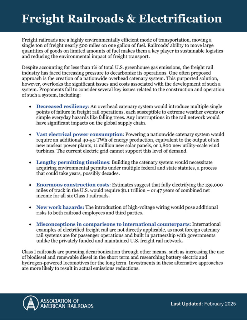 According to AAR Senior Vice President of Safety and Operations Michael Rush, “Railroads continue to identify and invest in technologies that will make the industry more sustainable and resilient. Today, railroads can move a single ton of freight nearly 500 miles on a single gallon of fuel, but we are striving for further improvements. This study puts to bed any notions that catenary is a viable solution. Now is the time to focus investments and attention on alternatives that can truly work for freight rail. Railroads are actively working to develop sustainable solutions that balance environmental benefits with the operational demands and practical realities of freight transportation. This study reinforces the imperative of channeling investments into technologies that have the potential to deliver tangible benefits—without the insurmountable challenges posed by catenary electrification.”