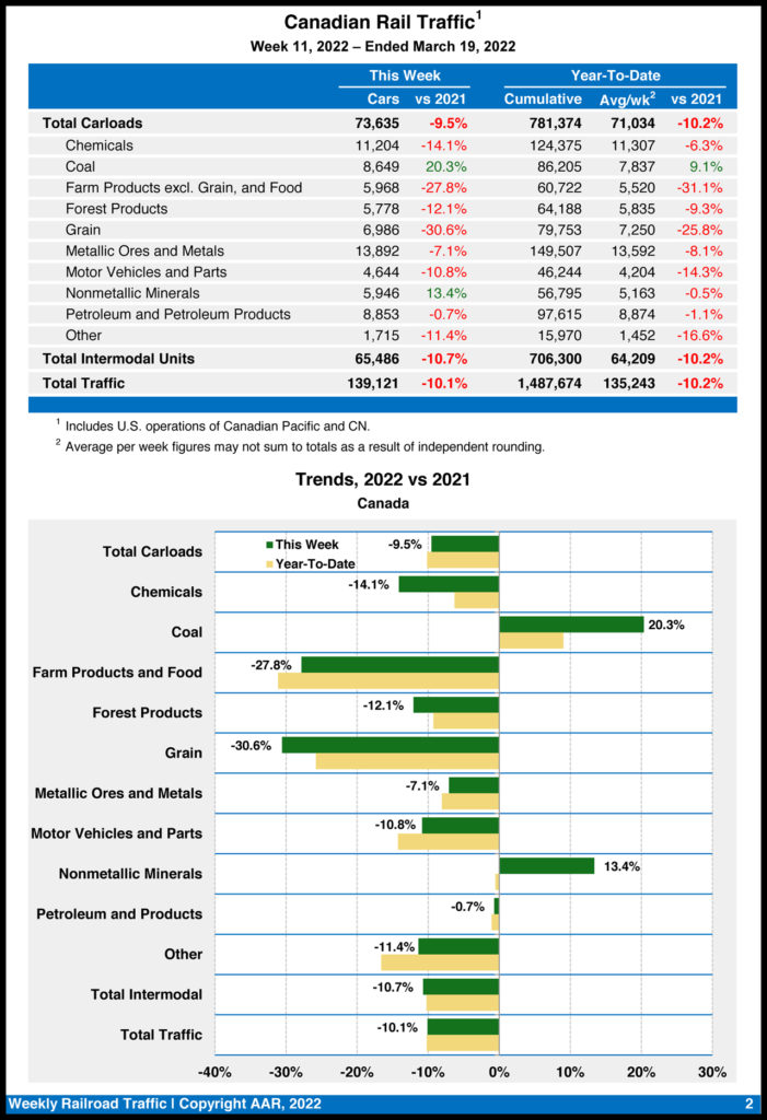 In comparison, U.S. rail traffic for week 10 (ending March 12, 2022) was 496,134 carloads and intermodal units, down 4.7% from the same week last year, based on 232,388 carloads—up 0.9% from 2021—and intermodal volume of 263,746 containers and trailers—down 9.1%, according to the AAR.