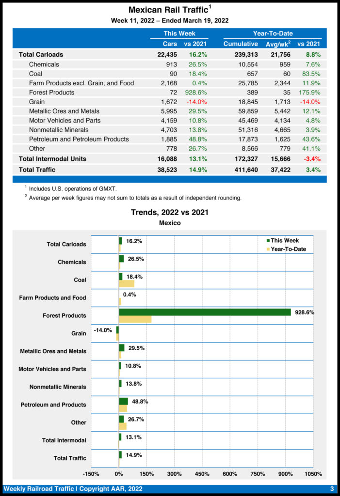 Mexican railroads reported 22,435 carloads for the week, gaining 16.2% from the same week last year, and 16,088 intermodal units, increasing 13.1%. Their cumulative volume for the first 11 weeks of 2022 was 411,640 carloads and intermodal containers and trailers, rising 3.4% from 2021.