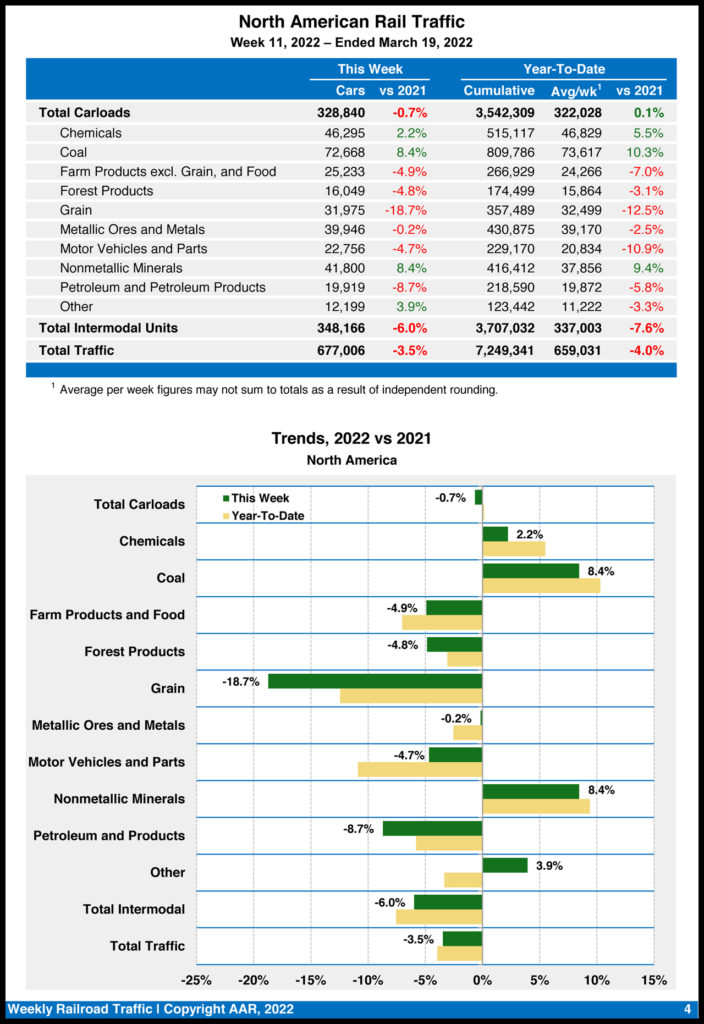 North American rail volume for the week ending March 19, 2022, on 12 reporting U.S., Canadian and Mexican railroads totaled 328,840 carloads, down 0.7% compared with the same week last year, and 348,166 intermodal units, down 6%. Total combined weekly rail traffic in North America was 677,006 carloads and intermodal units, down 3.5%. North American rail volume for the first 11 weeks of 2022 was 7,249,341 carloads and intermodal units, down 4% from 2021.