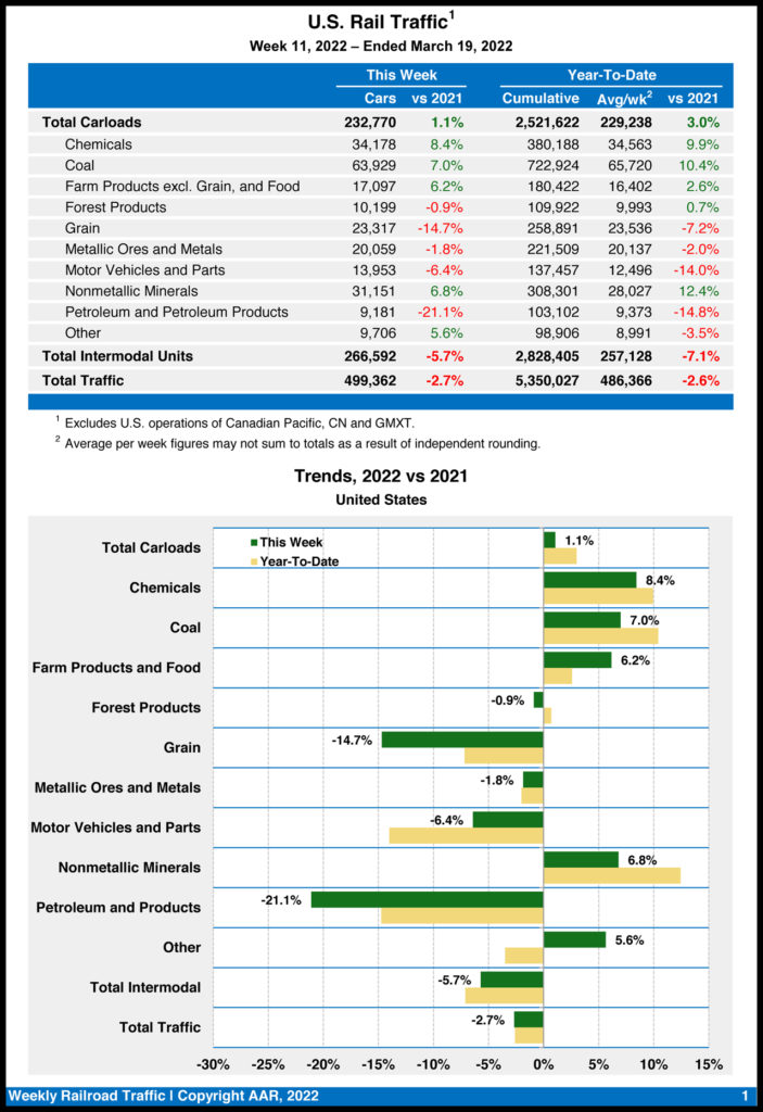 Week 11 (ending March 19, 2022) marks the second year since the pandemic began. Total U.S. weekly rail traffic came in at 499,362 carloads and intermodal units, down 2.7% compared with the same week in 2021, AAR reported on March 23. U.S. Class I railroads moved 232,770 carloads, increasing 1.1% from the prior-year period; and 266,592 containers and trailers, declining 5.7% from last year.