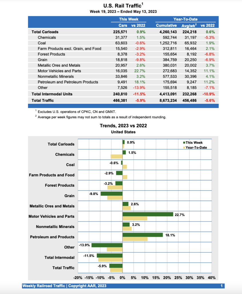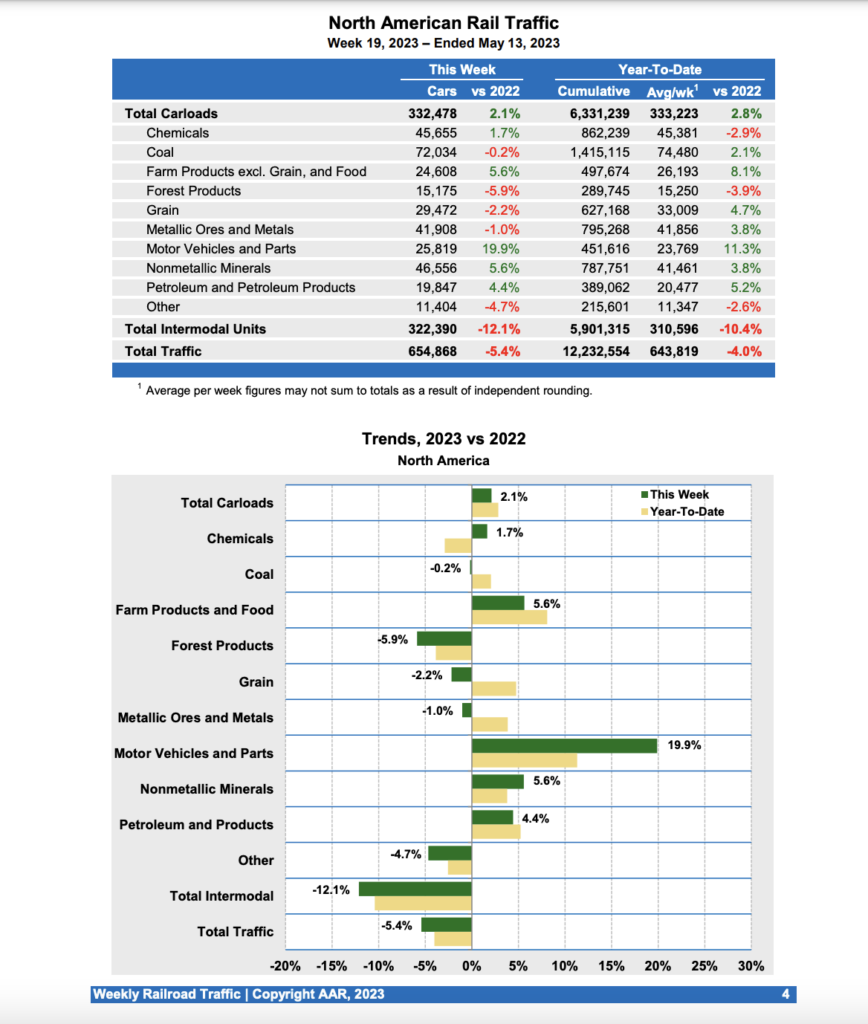 For the first 19 weeks of 2023 (ending May 13), total U.S. weekly rail traffic dipped 4.0% from the same point last year, according to the Association of American Railroads’ (AAR) May 17 report. Both Canada and the U.S. saw declines, while Mexico saw an increase.