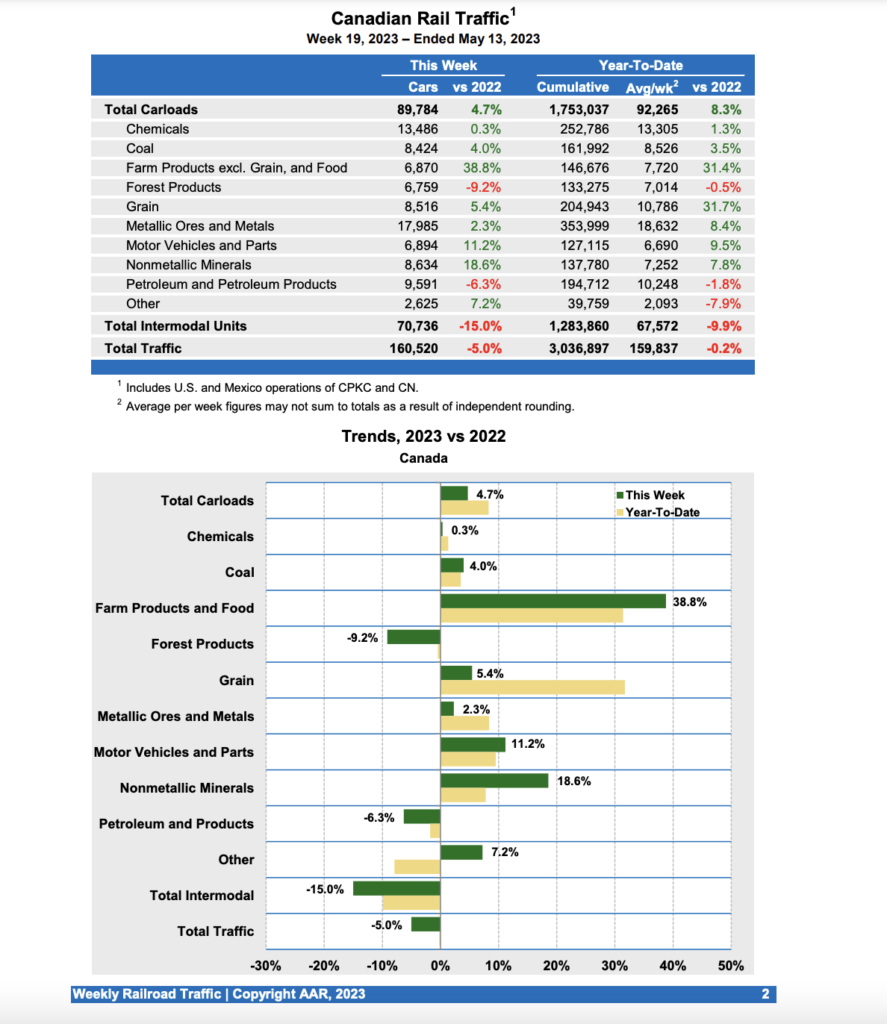 Canadian railroads reported 89,784 carloads for the week, up 4.7%, and 70,736 intermodal units, down 15.0% compared with the same week in 2022. For the first 19 weeks of 2023, Canadian railroads reported cumulative rail traffic volume of 3,036,897 carloads, containers and trailers, down 0.2%.