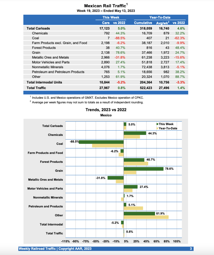 Mexican railroads reported 17,123 carloads for the week, up 5.0% compared with the same week last year, and 10,844 intermodal units, down 5.2%. Cumulative volume on Mexican railroads for the first 19 weeks of 2023 was 522,423 carloads and intermodal containers and trailers, up 1.4% from the same point last year.
