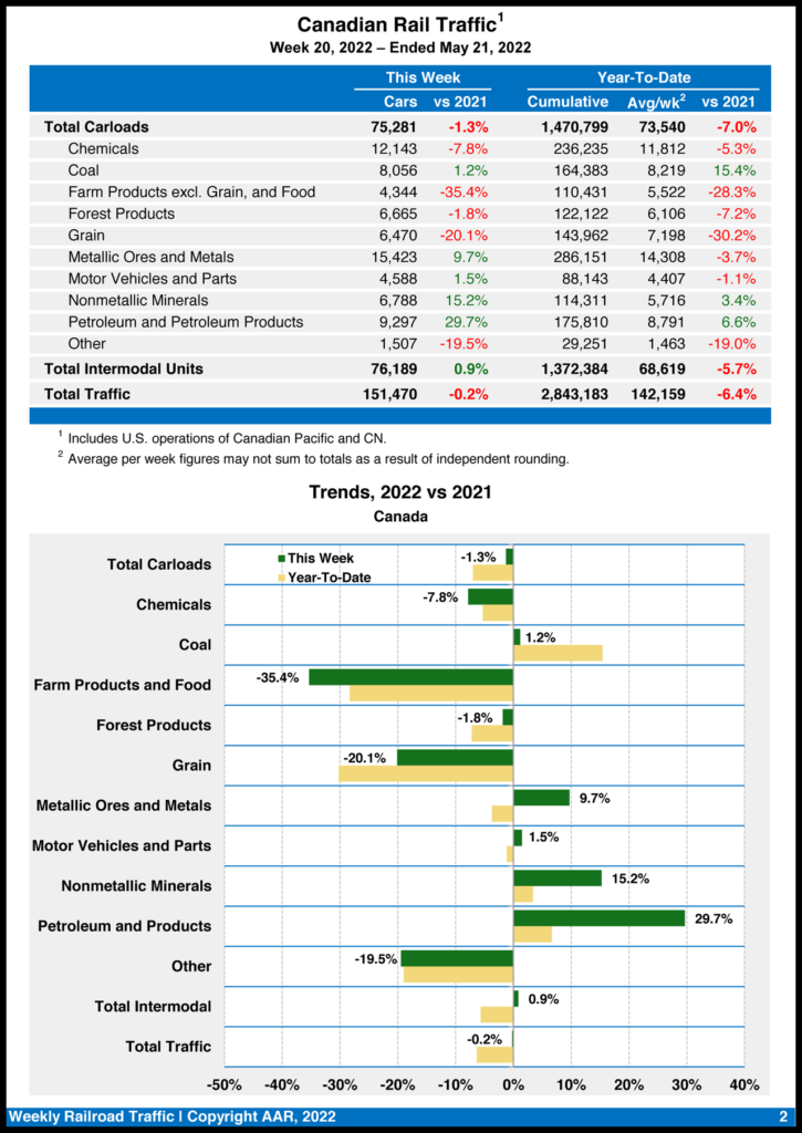 Canadian railroads reported 75,281 carloads for the week, down 1.3%, and 76,189 intermodal units, up 0.9% from the same week in 2021.