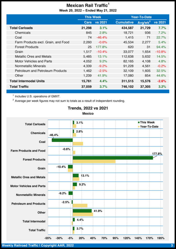 Mexican railroads reported 21,298 carloads for the week, up 3.1% compared with the same week in 2021, and 15,761 intermodal units, up 4.4%.