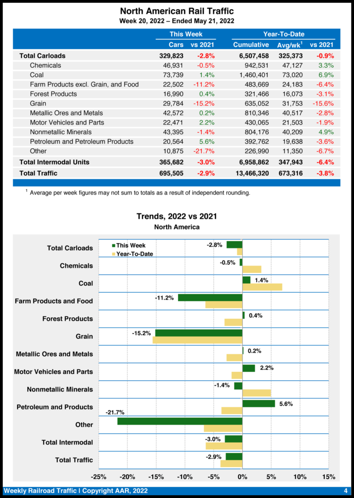 North American rail volume for the week ending May 21, 2022, on 12 reporting U.S., Canadian and Mexican railroads totaled 329,823 carloads, down 2.8% vs. the same week last year, and 365,682 intermodal units, down 3% vs. last year. Total combined weekly rail traffic in North America was 695,505 carloads and intermodal units, down 2.9%.