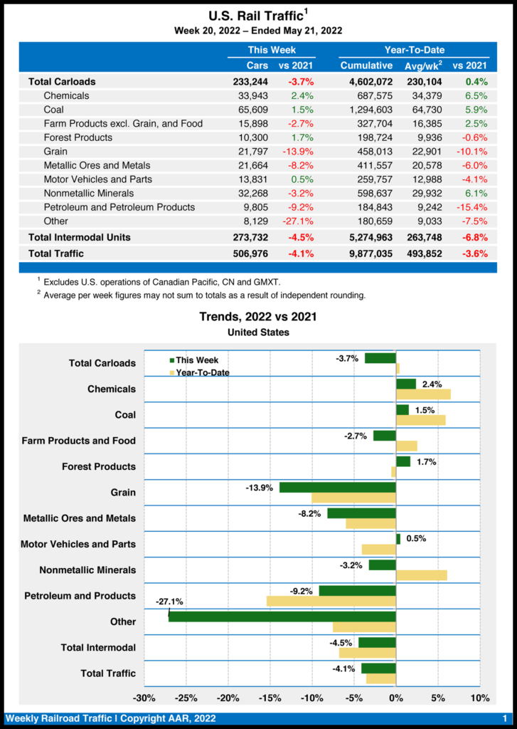 The Association of American Railroads (AAR) now has 20 weeks of rail traffic data for 2022 (ending May 21). Total North American carload and intermodal traffic dipped 3.8% from the same point last year—falling 3.6% in the U.S. and 6.4% in Canada, and rising 3.2% in Mexico.