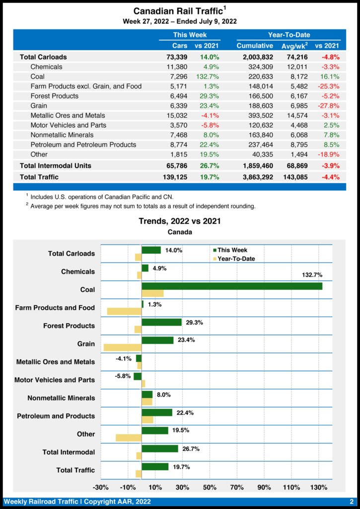 For the week ending July 9, 2022, four of the 10 carload commodity groups posted gains vs. the same week in 2021. They included coal, up 1,633 carloads, to 60,105; farm products excluding grain, and food, up 1,056 carloads, to 15,705; and motor vehicles and parts, up 409 carloads, to 10,725. Commodity groups that posted decreases included metallic ores and metals, down 4,422 carloads, to 18,019; chemicals, down 1,038 carloads, to 30,163; and petroleum and petroleum products, down 378 carloads, to 9,395.