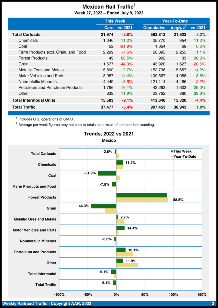 The Association of American Railroads (AAR) now has 27 weeks of rail traffic data for 2022 (ending July 9). Total North American carload and intermodal traffic dipped 3.4% from the same point last year—falling 3.1% in the U.S. and 4.4% in Canada, and rising 1% in Mexico.