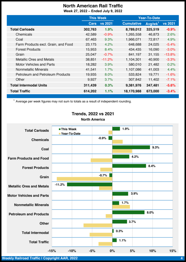 For the first 27 weeks of 2022, U.S. railroads reported cumulative volume of 6,201,367 carloads, down 0.2% from the same point last year; and 7,108,876 intermodal units, down 6.1% from last year.