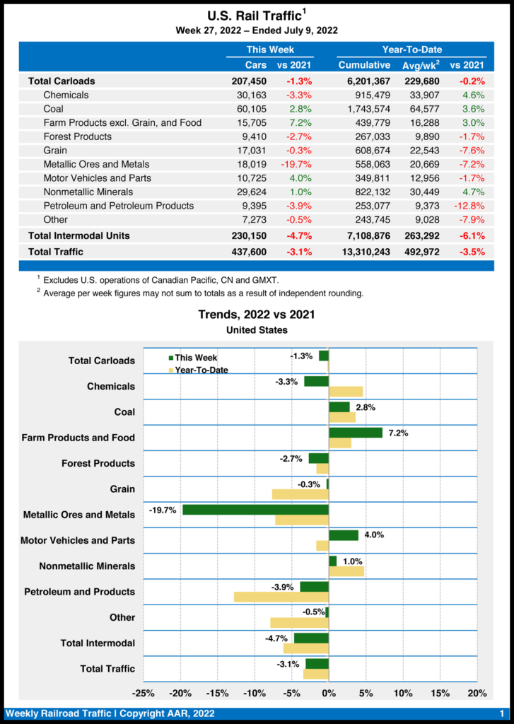 According to the AAR, for the week ending July 9, 2022, U.S. Class I railroads hauled a total of 437,600 carloads and intermodal units, decreasing 3.1% compared with the same week last year. This comprises 207,450 carloads—down 1.3% from the prior-year period—and 230,150 containers and trailers—down 4.7% compared with 2021.