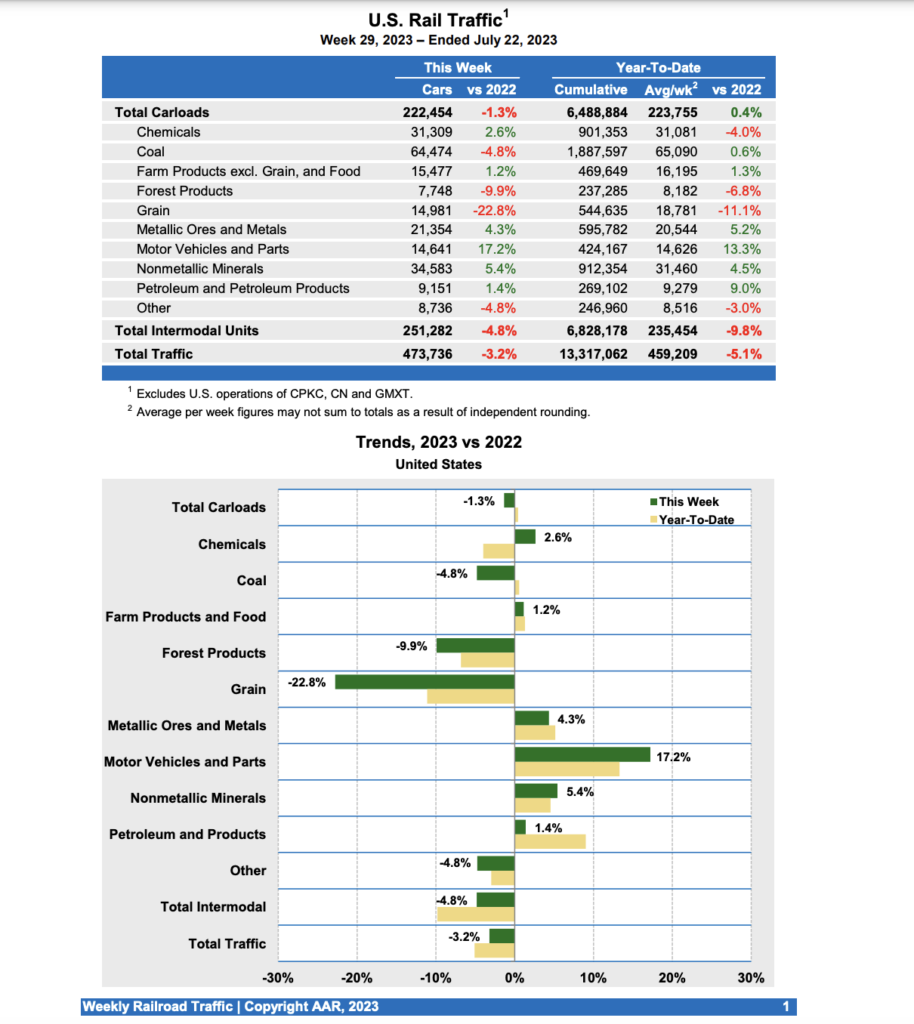According to AAR, for the week ending July 22, 2023, U.S. Class I railroads hauled a total of 473,736 carloads and intermodal units, falling 3.2% compared with the same week last year. This comprises 222,454 carloads—down 1.3% from the prior-year period—and 251,282 containers and trailers—down 4.8% compared with 2022.