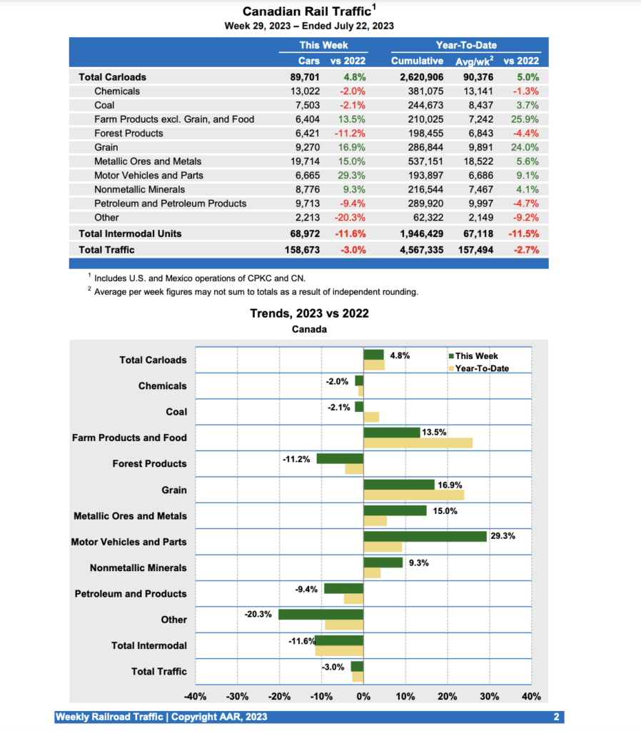 Canadian railroads reported 89,701 carloads for the week, up 4.8%, and 68,972 intermodal units, down 11.6% compared with the same week in 2022. For the first 29 weeks of 2023, Canadian railroads reported cumulative rail traffic volume of 4,567,335 carloads, containers and trailers, down 2.7%.