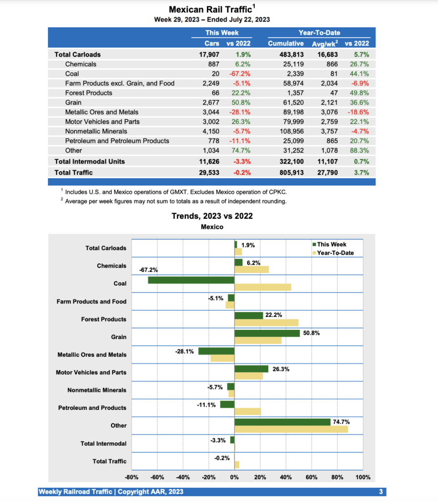 Mexican railroads reported 17,907 carloads for the week, up 1.9% compared with the same week last year, and 11,626 intermodal units, down 3.3%. Cumulative volume on Mexican railroads for the first 29 weeks of 2023 was 805,913 carloads and intermodal containers and trailers, up 3.7% from the same point last year.