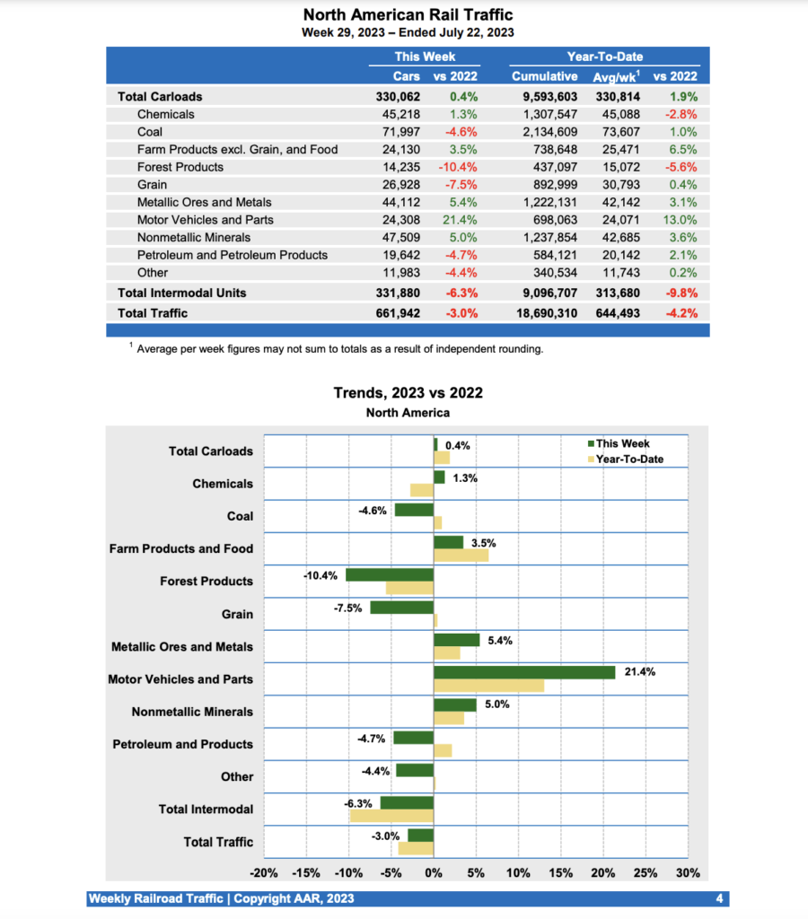 For the first 29 weeks of 2023, U.S. railroads reported cumulative volume of 6,488,884 carloads, up 0.4% from the same point last year; and 6,828,178 intermodal units, down 9.8% from last year.