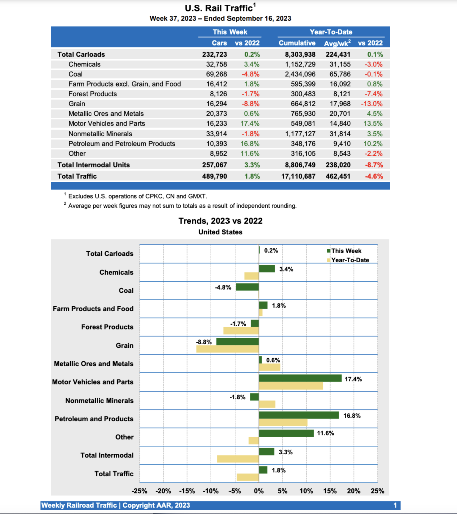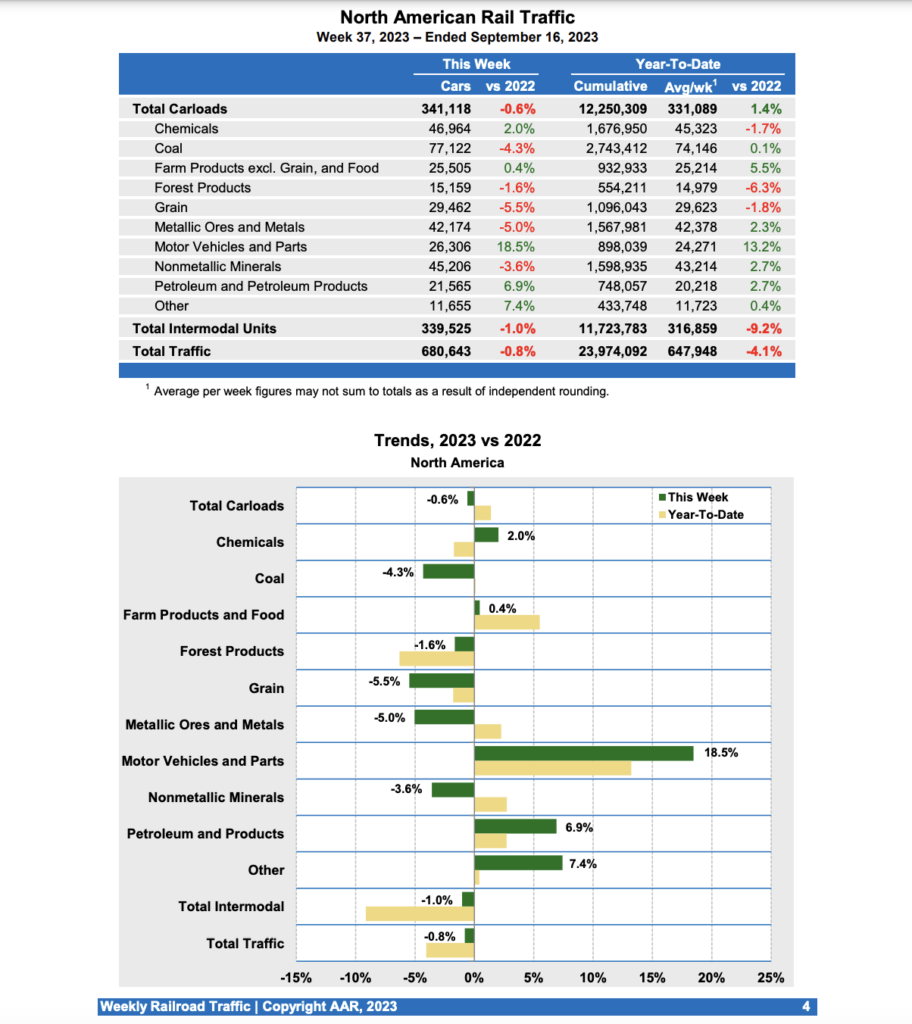 For the first 37 weeks of 2023 (ending Sept. 16), total U.S. weekly rail traffic dipped 4.1% from the same point last year, according to the Association of American Railroads’ (AAR) Sept. 20 report. Both Canada and the U.S. saw declines, while Mexico saw an increase.