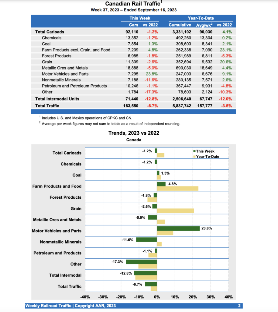 Canadian railroads reported 92,110 carloads for the week, down 1.2%, and 71,440 intermodal units, down 12.8% compared with the same week in 2022. For the first 37 weeks of 2023, Canadian railroads reported cumulative rail traffic volume of 5,837,742 carloads, containers and trailers, down 3.5%.