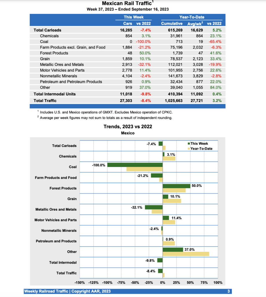 Mexican railroads reported 16,285 carloads for the week, down 7.4% compared with the same week last year, and 11,018 intermodal units, down 9.8%. Cumulative volume on Mexican railroads for the first 37 weeks of 2023 was 1,025,663 carloads and intermodal containers and trailers, up 3.2% from the same point last year.