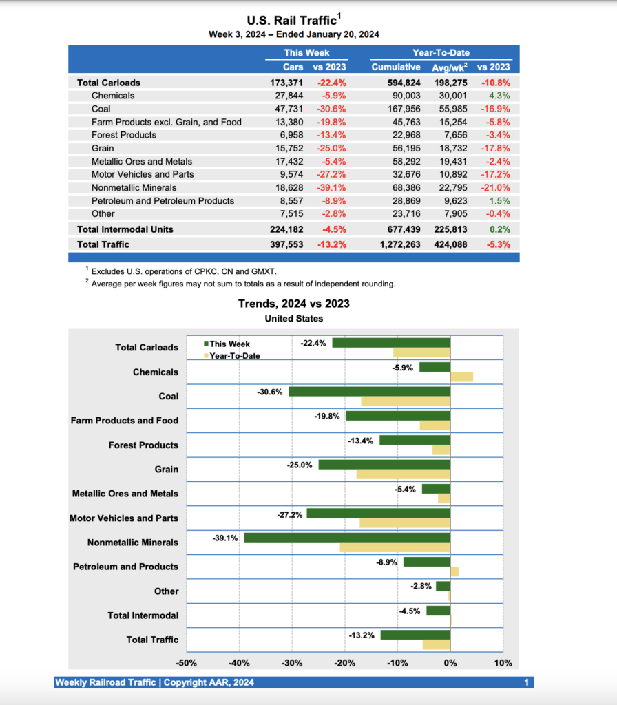 For the week ending Jan. 20, 2024, U.S. Class I railroads hauled a total of 397,553 carloads and intermodal units, falling 13.2% from the prior-year period, according to AAR. This comprises 173,371 carloads, down 22.4% from 2023, and 224,182 containers and trailers, down 4.5% compared with last year.