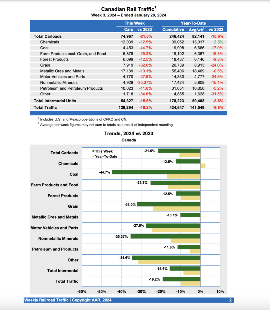 Canadian railroads reported 74,967 carloads for the week ending Jan. 20, 2024, a 21.5% fall-off, and 54,327 intermodal units, a 15.6% decrease compared with the prior-year period.