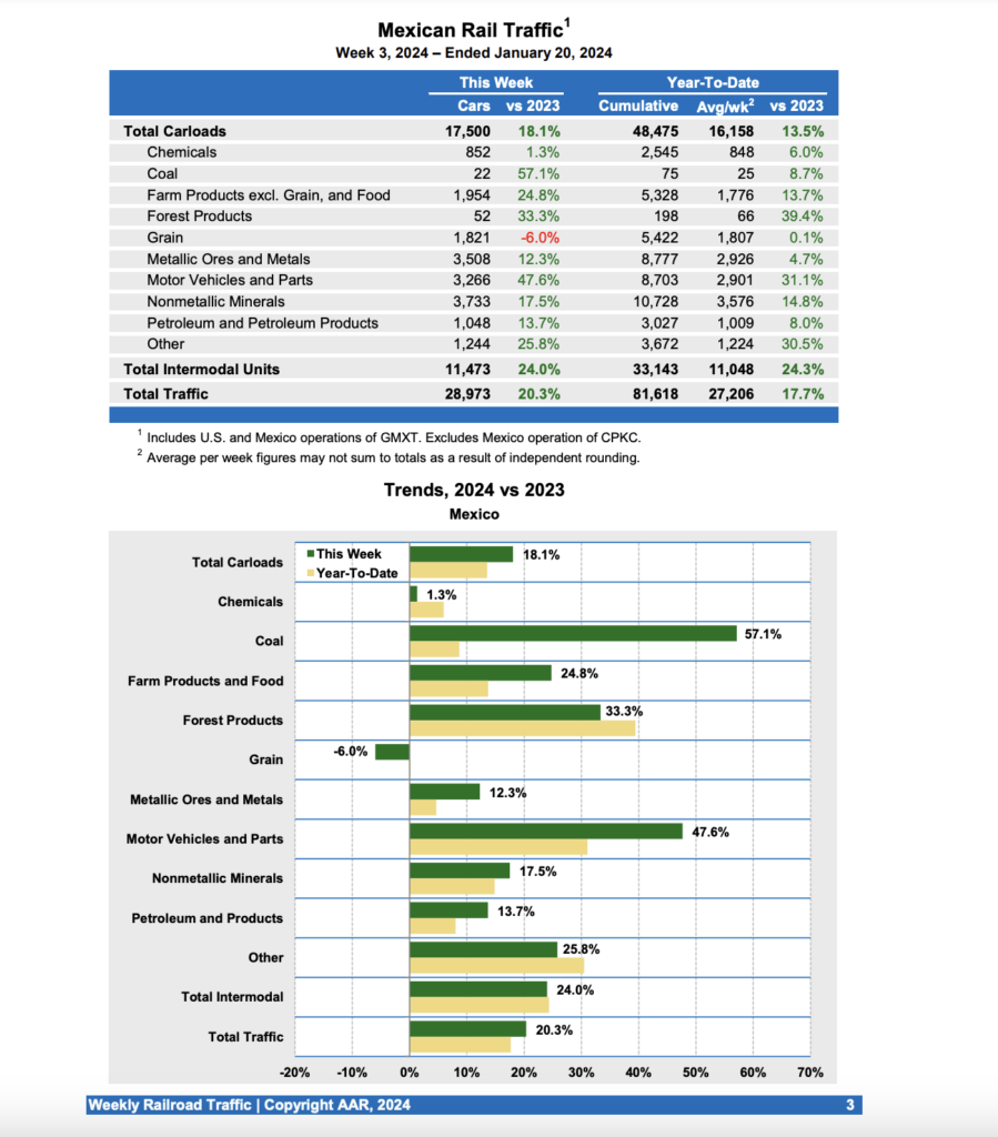 For the week ending Jan. 20, 2024, Mexican railroads reported 17,500 carloads, rising 18.1% from 2023, and 11,473 intermodal units, increasing 24.0%.