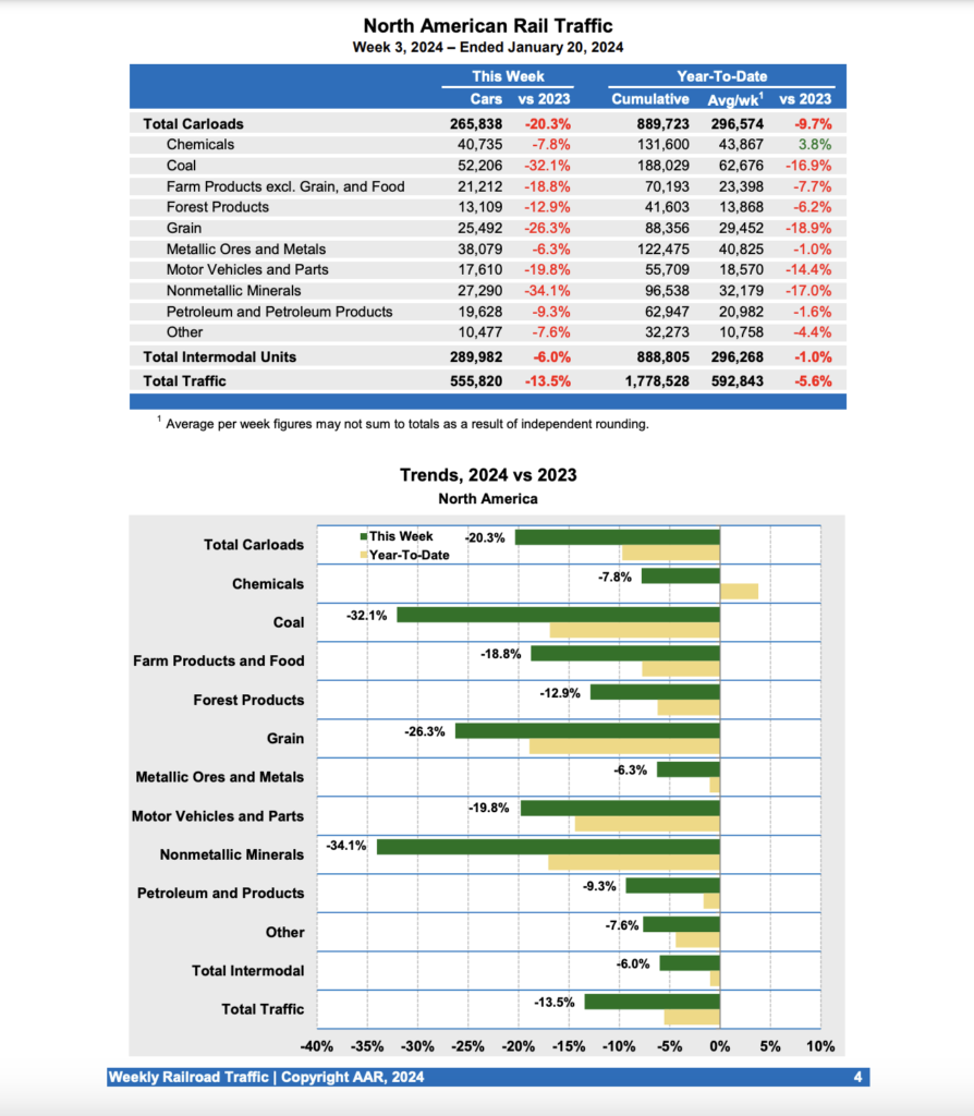 U.S. railroads for the first three weeks of this year reported cumulative volume of 594,824 carloads, down 10.8% from the same point in 2023; and 677,439 intermodal units, up 0.2% from 2023.