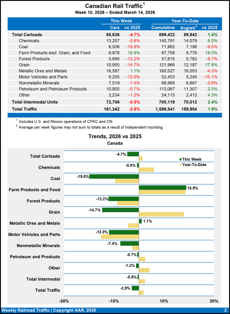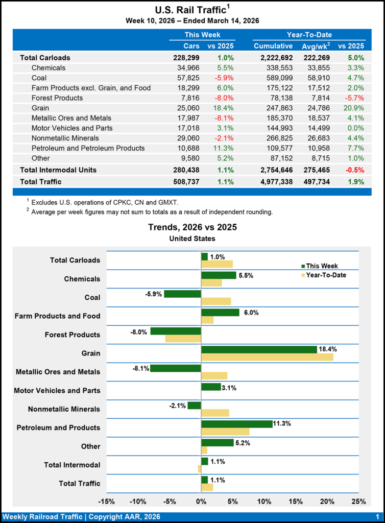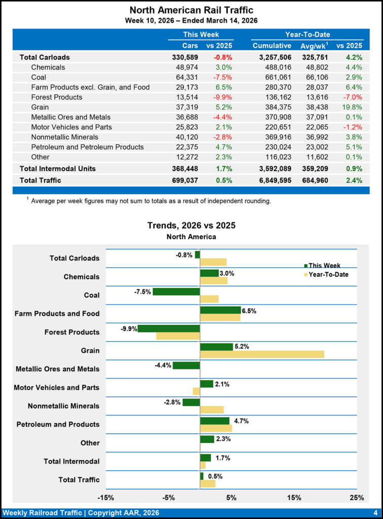 Six of the 10 carload commodity groups posted an increase for the week ending March 14, 2026, compared with the same week in 2025. They included grain, up 3,890 carloads, to 25,060; chemicals, up 1,837 carloads, to 34,966; and petroleum and petroleum products, up 1,088 carloads, to 10,688. Commodity groups that posted declines included coal, down 3,618 carloads, to 57,825; metallic ores and metals, down 1,584 carloads, to 17,987; and forest products, down 684 carloads, to 7,816.