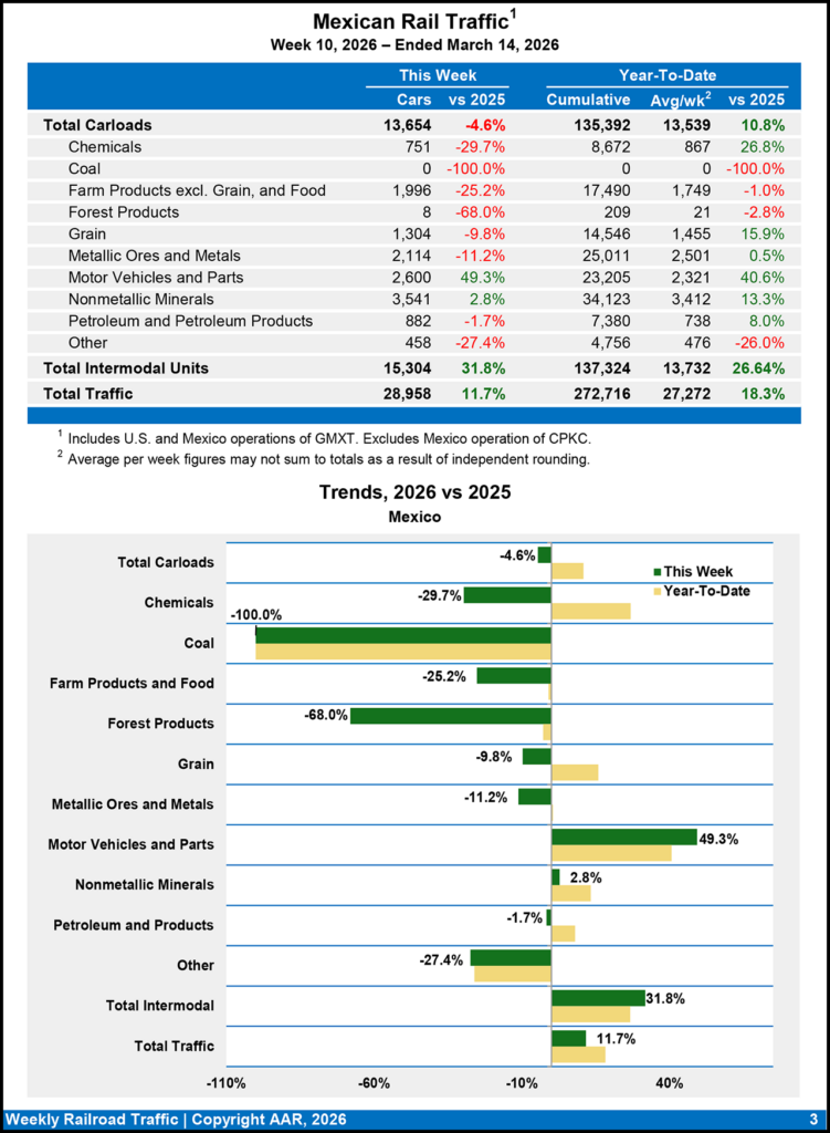 Mexican railroads reported 13,654 carloads for the week ending March 14, 2026, falling 4.6% from the same point last year, and 15,304 intermodal units, gaining 31.8%.
