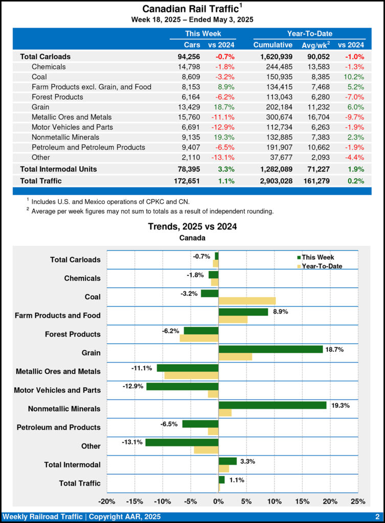 For the week ending May 3, 2025, Canadian railroads reported 94,256 carloads, down 0.7%, and 78,395 intermodal units, up 3.3% compared with the same week last year.