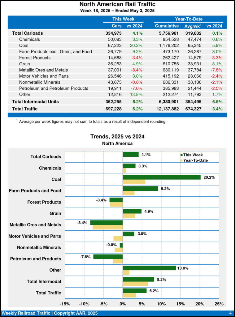 For the first 18 weeks of this year, U.S. railroads reported cumulative volume of 3,903,379 carloads, a 1.8% increase over 2024; and 4,902,228 intermodal units, an 8.1% increase over last year.