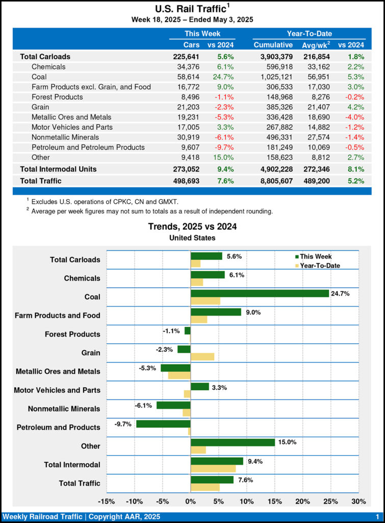 According to the AAR, U.S. Class I railroads carried 498,693 carloads and intermodal units for the week ending May 3, 2025, up 7.6% compared with the same point last year. That comprised 225,641 carloads, up 5.6% from 2024, and 273,052 containers and trailers, up 9.4% from last year.
