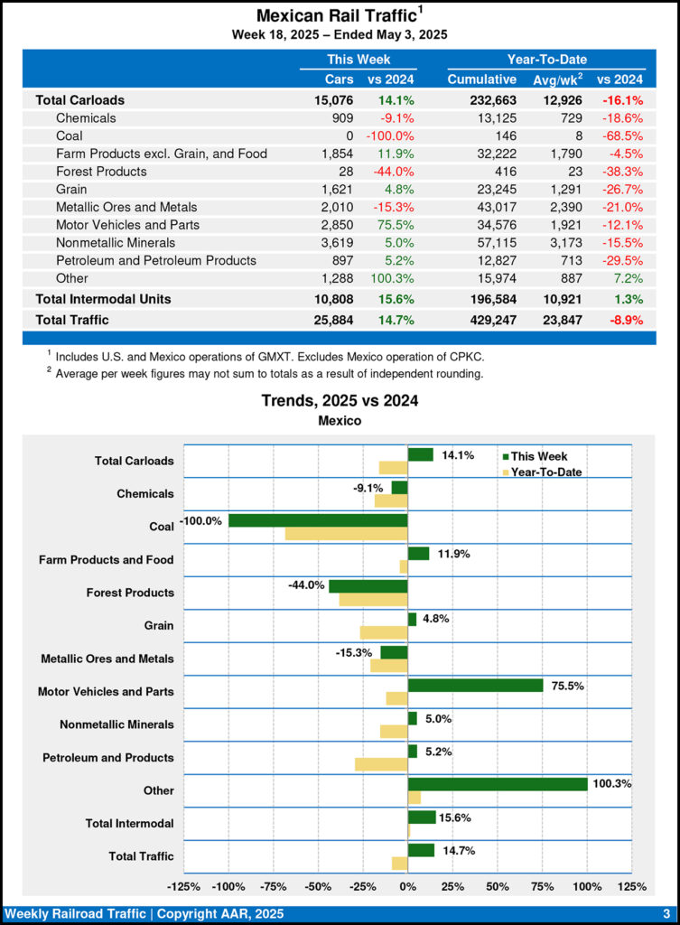 Mexican railroads reported 15,076 carloads for the week ending May 3, 2025, gaining 14.1% from the same point last year, and 10,808 intermodal units, rising 15.6%.