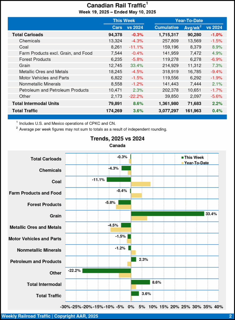 Canadian railroads reported 94,378 carloads for the week ending May 10, 2025, dipping 0.3%, and 79,891 intermodal units, rising 8.6% from the same point last year.