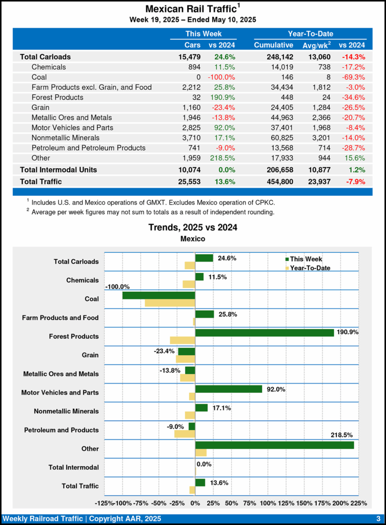 Mexican railroads reported 15,479 carloads for the week ending May 10, 2025, jumping up 24.6% from the same week last year, and 10,074 intermodal units, flat with last year.