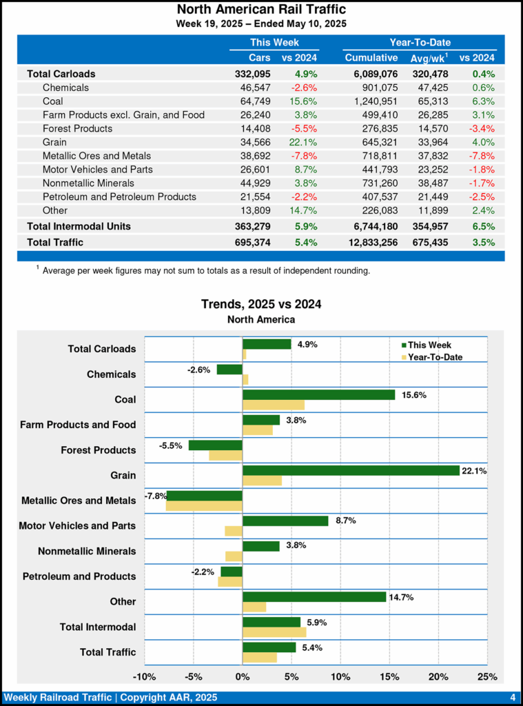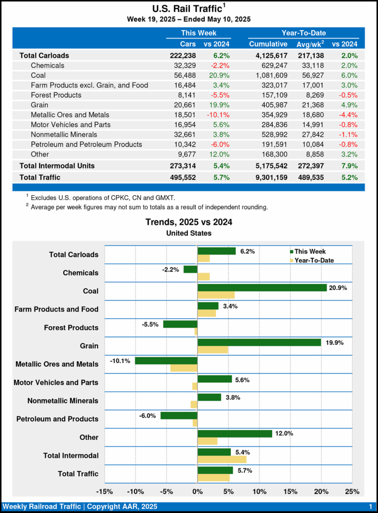 For the first 19 weeks of this year, U.S. railroads reported cumulative volume of 4,125,617 carloads, a 2.0% increase over 2024; and 5,175,542 intermodal units, a 7.9% gain over last year.