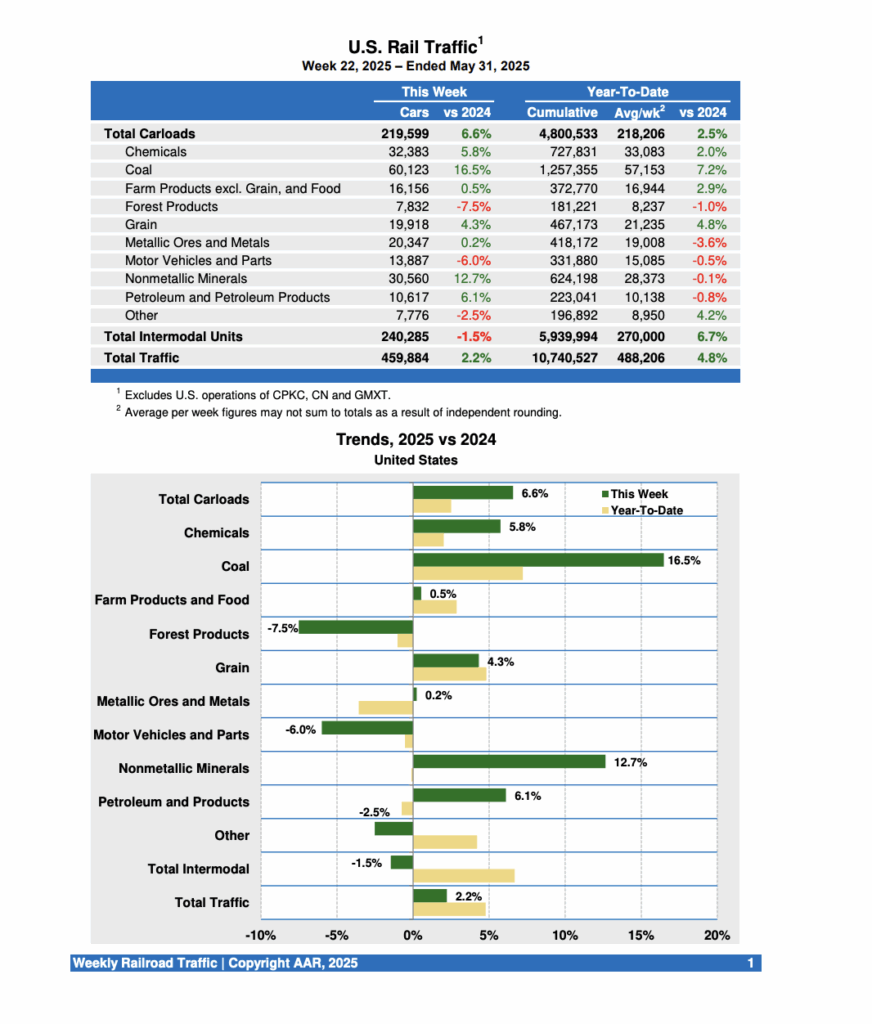 For the week ending May 31, 2025, U.S. Class I railroads carried 459,884 carloads and intermodal units, up 2.2% compared with the same point last year, according to the AAR. That comprised 219,599 carloads, up 6.6% from last year, and 240,285 containers and trailers, down 1.5% from 2024.