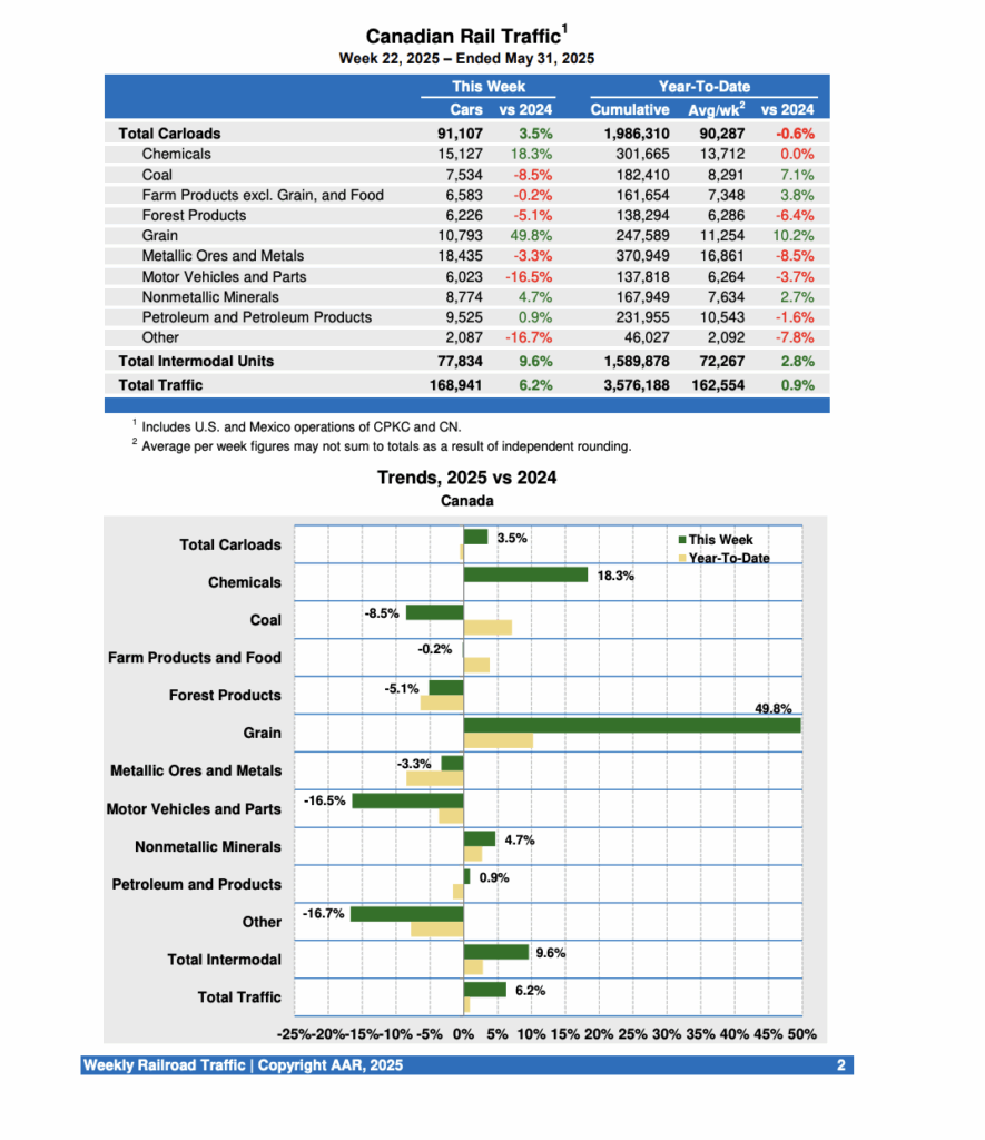 Canadian railroads reported 91,107 carloads for the week ending May 31, 2025, rising 2.5%, and 77,834 intermodal units, increasing 9.6% from the same week last year.