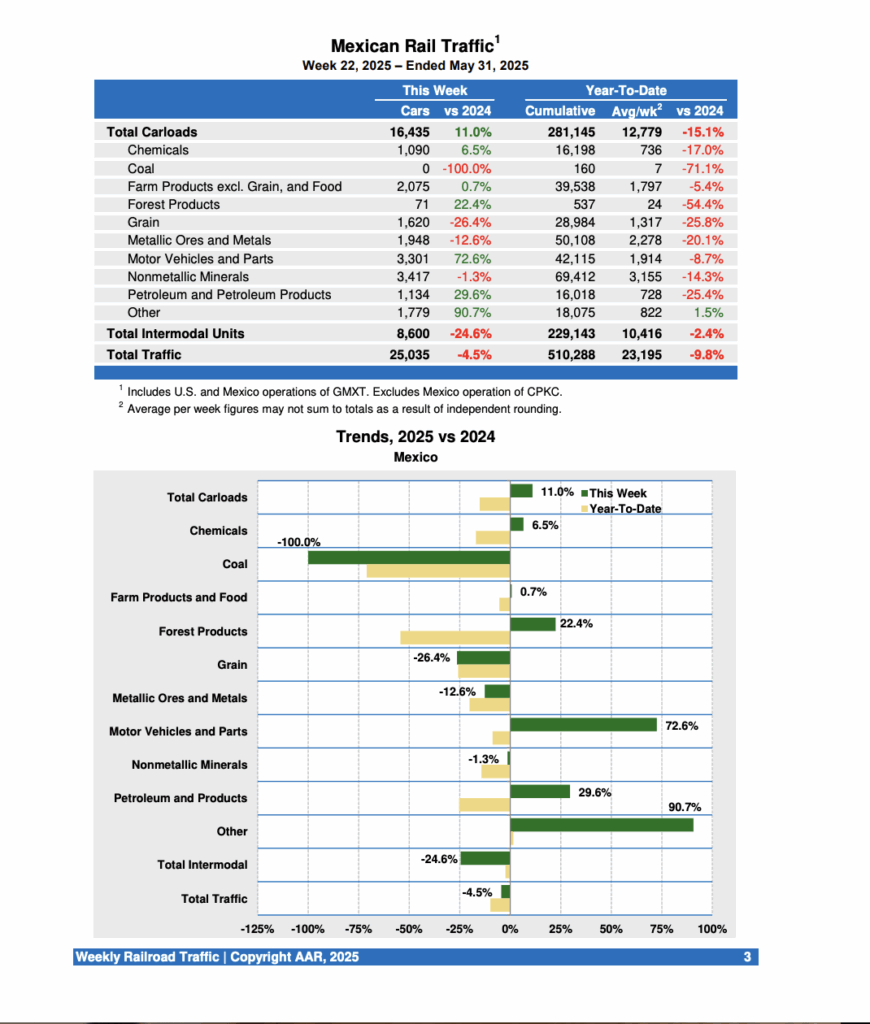 For the week ending May 31, 2025, Mexican railroads reported 16,435 carloads, up 11.0% from the same point last year, and 8,600 intermodal units, down 24.6%.