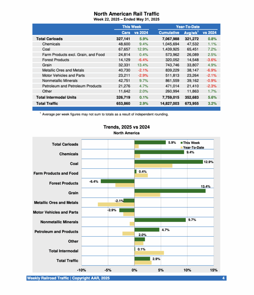 North American rail volume for the week ending May 31, 2025, on nine reporting U.S., Canadian, and Mexican railroads totaled 327,141 carloads, up 5.9% from the same week last year, and 326,719 intermodal units, up 0.1% compared with last year. Total combined weekly rail traffic in North America was 653,860 carloads and intermodal units, up 2.9%.