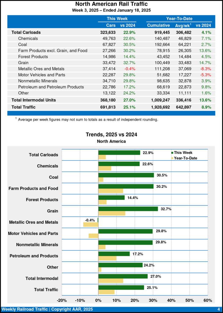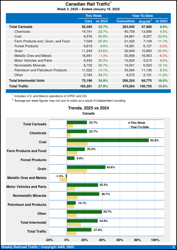 Canadian railroads reported 92,085 carloads for the week ending Jan. 18, 2025, a 22.7% increase, and 73,196 intermodal units, a 34.9% gain over the same week last year.