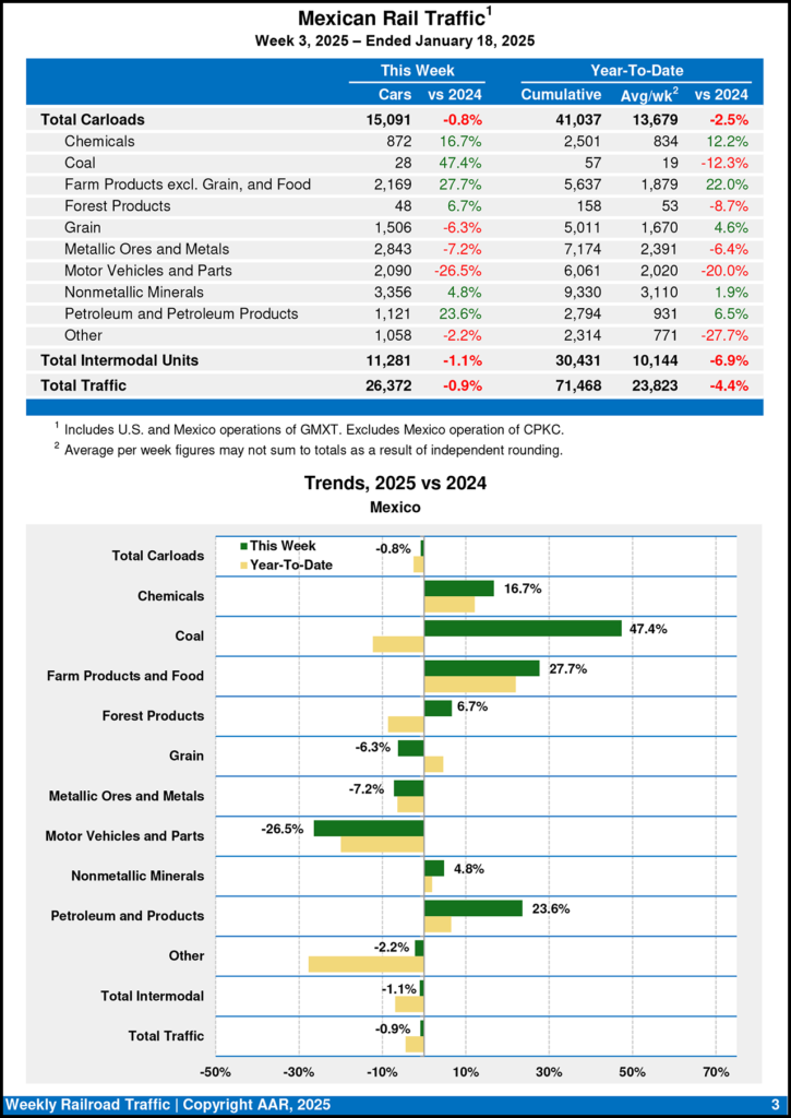 For the week ending Jan. 18, 2025, Mexican railroads reported 15,091 carloads, down 0.8% vs. the year-ago period, and 11,281 intermodal units, down 1.1%.