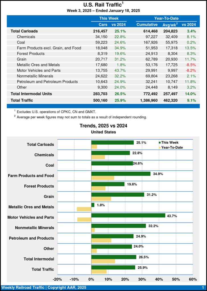 According to the AAR, U.S. Class I railroads hauled 500,160 carloads and intermodal units for the week ending Jan. 18, 2025, a 25.9% increase over the same week last year. That comprised 216,457 carloads, up 25.1% from 2024, and 283,703 containers and trailers, up 26.5% from last year.